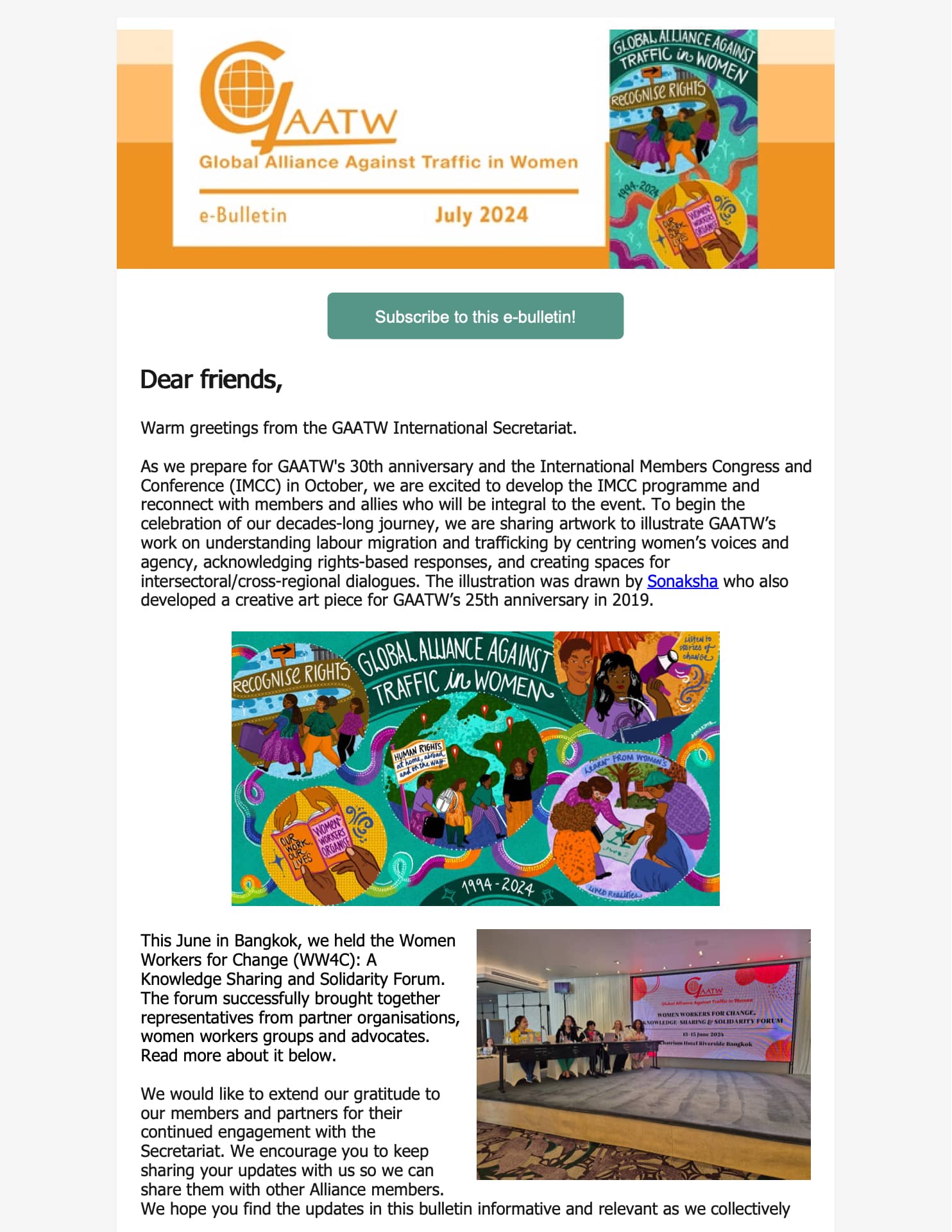 As we step into the middle of the year, we present to you the second issue of our e- bulletin. The first quarter of 2024 has been a busy one. We have met with many of you to plan GAATW’s 30th anniversary and the International Members Congress and Conference (IMCC) which will be held in Bangkok on 15-18 October 2024.